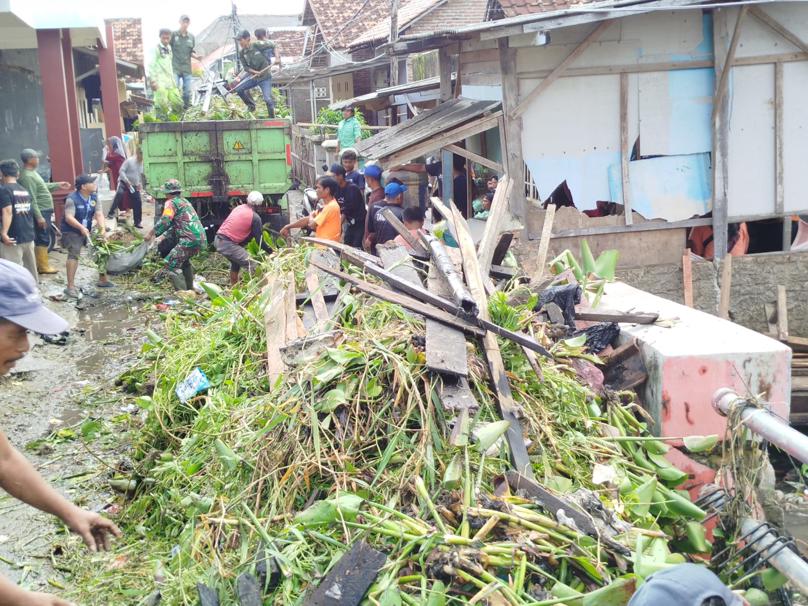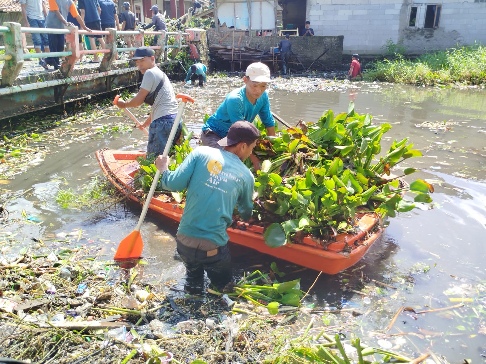 Dalam kegiatan tersebut, tumpukan sampah rumah tangga serta tumbuhan liar berupa eceng gondok yang menumpuk di sepanjang aliran sungai berhasil diangkut menggunakan sejumlah kendaraan truk. Pembersihan dilakukan secara menyeluruh guna mengembalikan fungsi aliran sungai yang selama ini tersumbat.